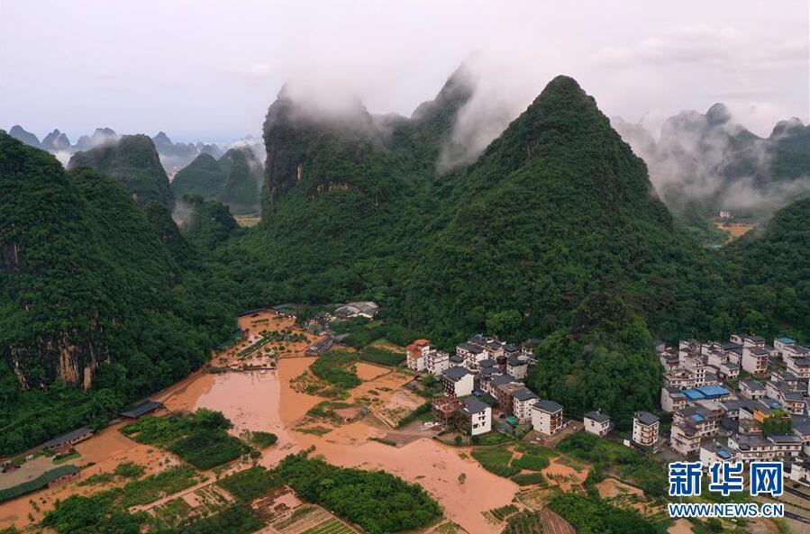 這是廣西陽朔縣部分出現(xiàn)嚴(yán)重積水的村莊(6月7日攝,無人機(jī)照片)。新華社記者陸波岸攝