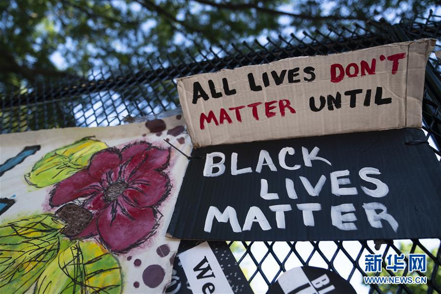6月8日,美國(guó)華盛頓白宮附近的隔離圍欄上貼著抗議標(biāo)語(yǔ)。新華社記者劉杰攝