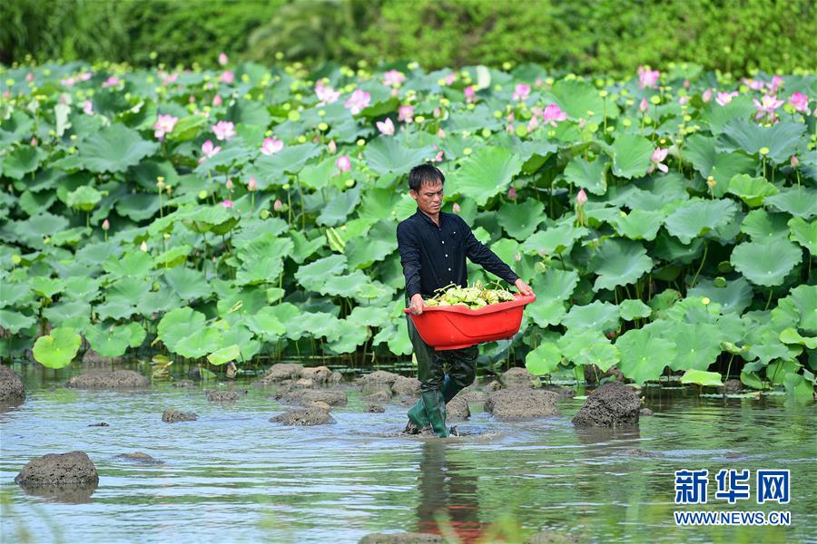 6月9日,村民在??邶埲A區(qū)龍泉鎮(zhèn)美仁坡村采摘蓮蓬。初夏時(shí)節(jié),位于海南海口龍華區(qū)龍泉鎮(zhèn)的蓮蓬逐漸成熟,當(dāng)?shù)卮迕窦泳o采摘,一派繁忙景象。新華社記者蒲曉旭攝