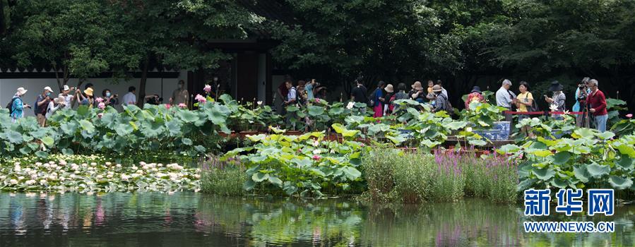 6月12日,游人在西湖郭莊觀看荷展。隨著氣溫升高,杭州西湖荷花次第開(kāi)放,引得游人駐足。新華社記者 翁忻旸 攝