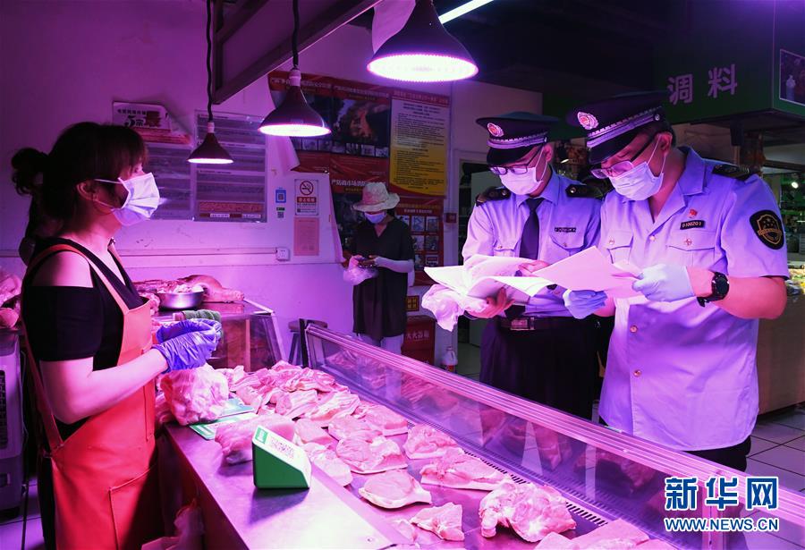 6月17日,在位于北京市海淀區(qū)的增光鴻運市場,執(zhí)法人員對商戶出售的鮮肉進行檢查。新華社記者 任超 攝