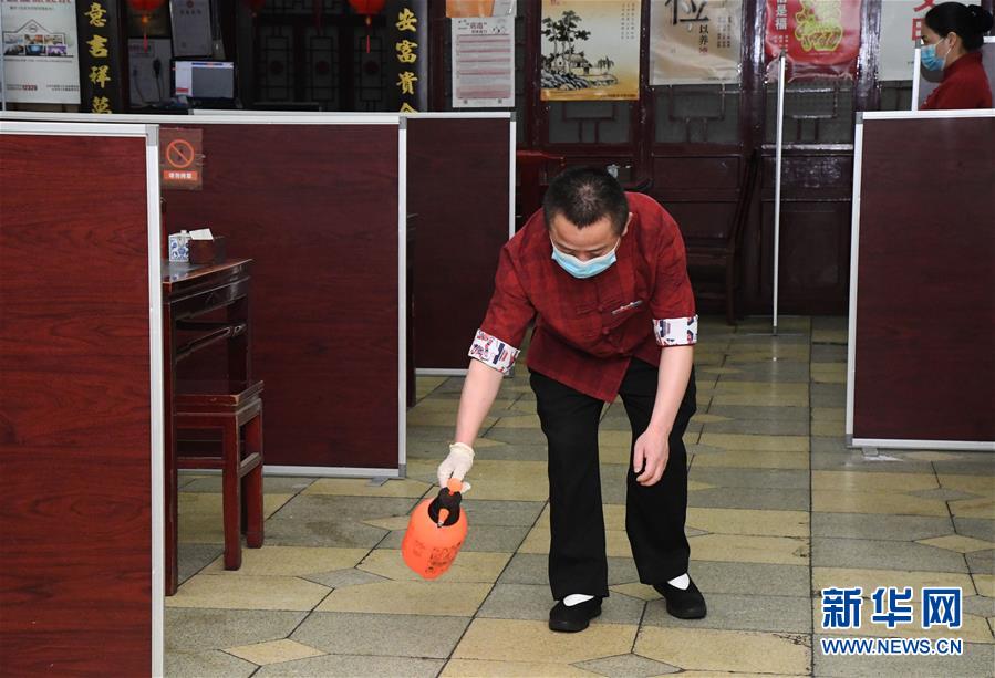 6月17日,在位于北京市海淀區(qū)的海碗居增光路店,工作人員對地面進行消毒。新華社記者 任超 攝