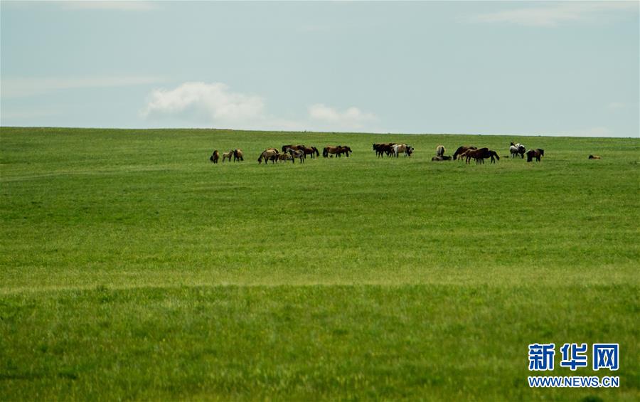 6月18日,馬群在錫林郭勒盟西烏珠穆沁草原上吃草。初夏時節(jié),內(nèi)蒙古中部的錫林郭勒大草原風(fēng)景如畫。新華社記者連振攝