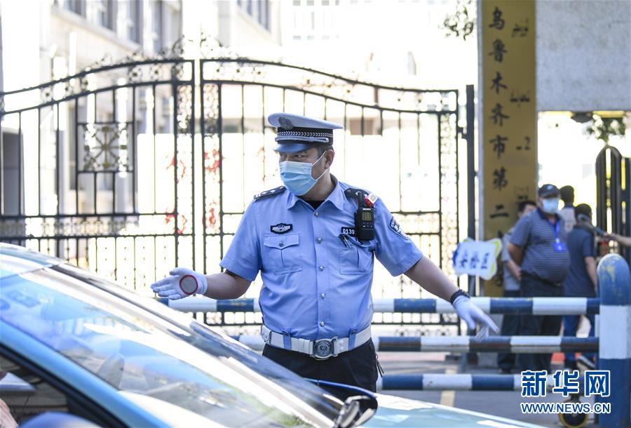 6月20日,在烏魯木齊市第二中學(xué)門前,烏魯木齊市公安局交警支隊天山區(qū)大隊新華路中隊警官羅曉亮在指揮交通。當日,烏魯木齊市初中升高中考試開始。為保障為期三天的中考順利進行,烏魯木齊市公安局交警支隊在各考點執(zhí)勤,為考生保駕護航新華社記者 王菲 攝