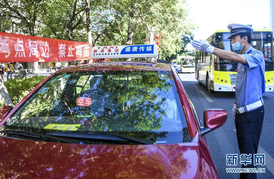 6月20日,在烏魯木齊市第十一中學(xué)門前,烏魯木齊市公安局交警支隊天山區(qū)大隊新華路中隊警官肖健波提醒過往車輛減速慢行、禁止鳴笛。當日,烏魯木齊市初中升高中考試開始。為保障為期三天的中考順利進行,烏魯木齊市公安局交警支隊在各考點執(zhí)勤,為考生保駕護航新華社記者 王菲 攝