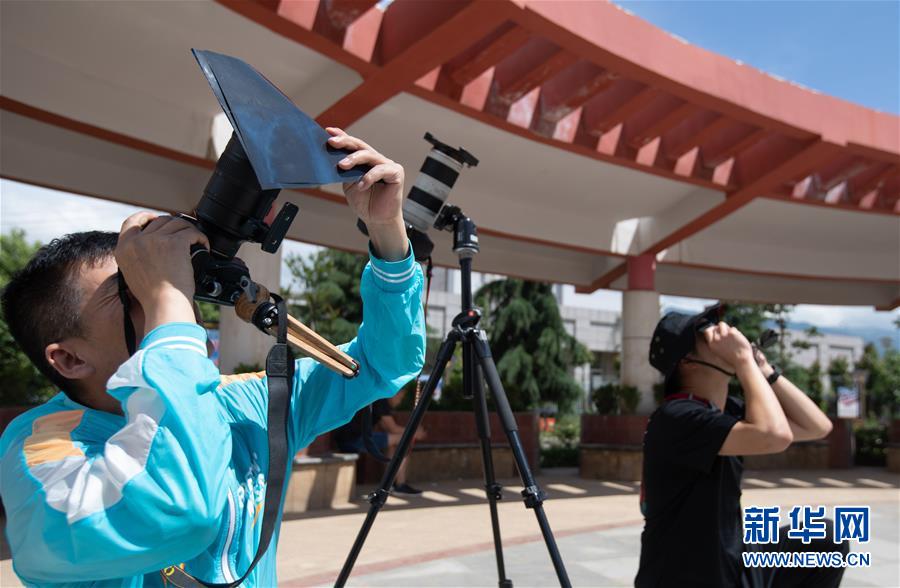 6月21日,在四川省布拖縣城,攝影師在拍攝日環(huán)食?!叭窄h(huán)食”天文景觀于6月21日“夏至日”下午在天宇上演。新華社記者 江宏景 攝