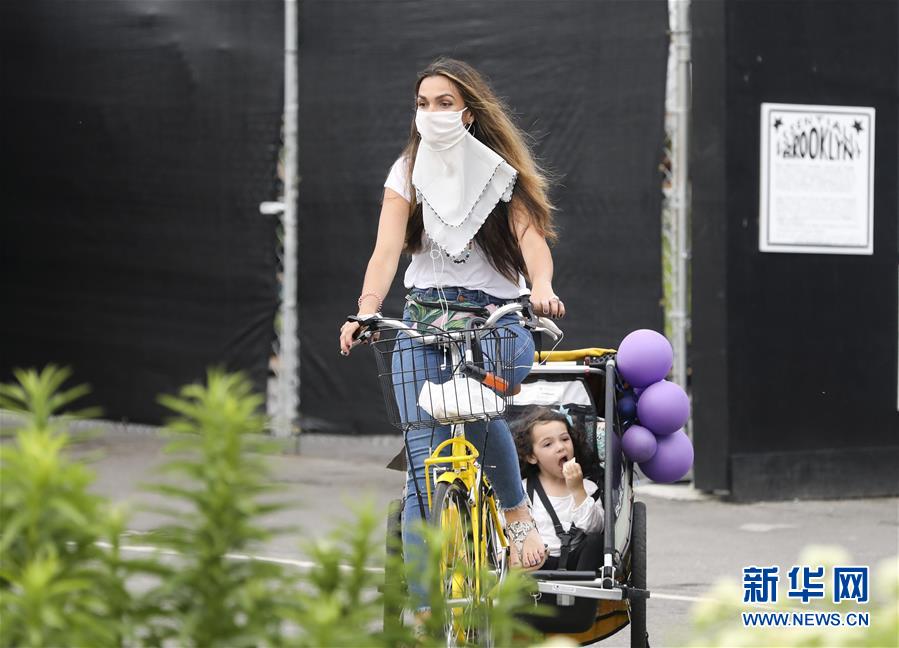 6月27日,一名女士在美國紐約多米諾公園內(nèi)騎車帶孩子游玩。美國約翰斯·霍普金斯大學(xué)27日發(fā)布的新冠疫情最新統(tǒng)計數(shù)據(jù)顯示,截至美國東部時間27日16時35分(北京時間28日4時35分),美國累計新冠確診病例2500419例,累計死亡病例125434例。新華社記者王迎攝