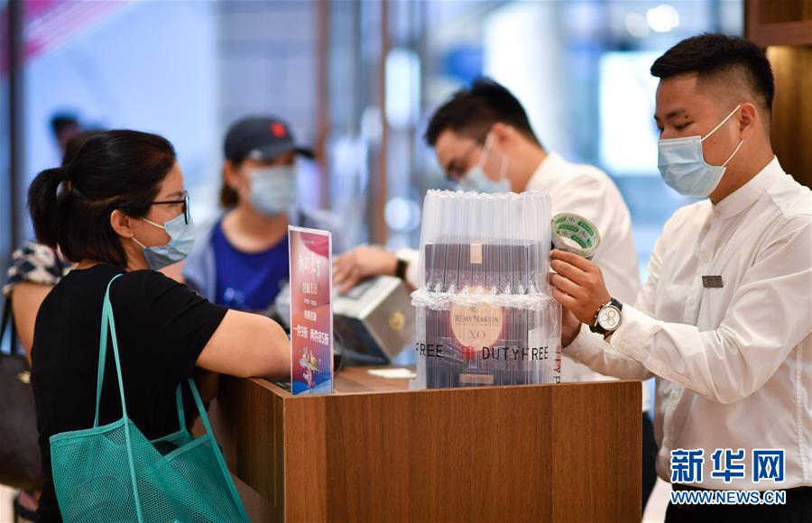 7月1日,海口日月廣場免稅店的工作人員為顧客打包酒類商品。當(dāng)日,海南開始實施調(diào)整后的離島免稅購物政策。海南離島旅客每年每人免稅購物額度提高至10萬元,電子消費產(chǎn)品等7類新增商品開售。新華社記者郭程攝