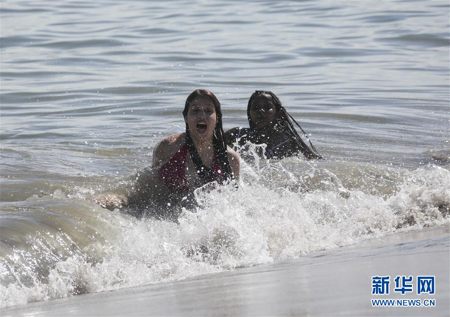 7月1日,人們在美國紐約科尼島戲水。當(dāng)日,美國紐約市屬八處海灘正式重新準(zhǔn)許民眾游泳,救生員也同時(shí)上崗。新華社記者王迎攝