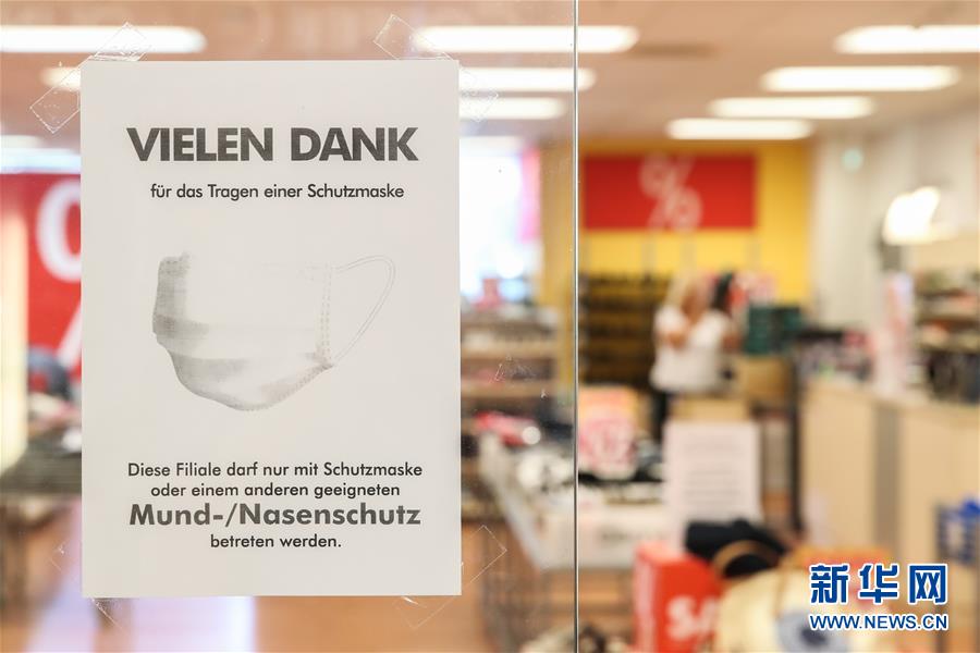 這是7月7日在德國(guó)首都柏林拍攝的一間商鋪張貼著提示顧客佩戴口罩的告示。針對(duì)有地方官員呼吁取消民眾乘坐公交車和在商場(chǎng)購(gòu)物時(shí)須戴口罩的規(guī)定,德國(guó)聯(lián)邦政府6日表示,支持延續(xù)“口罩強(qiáng)制令”。4月底,德國(guó)全部16個(gè)聯(lián)邦州陸續(xù)出臺(tái)“口罩強(qiáng)制令”,即居民在乘坐公交車和購(gòu)物時(shí)須佩戴口罩。新華社記者單宇琦攝