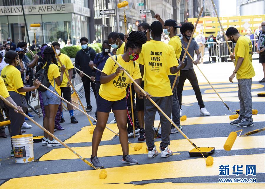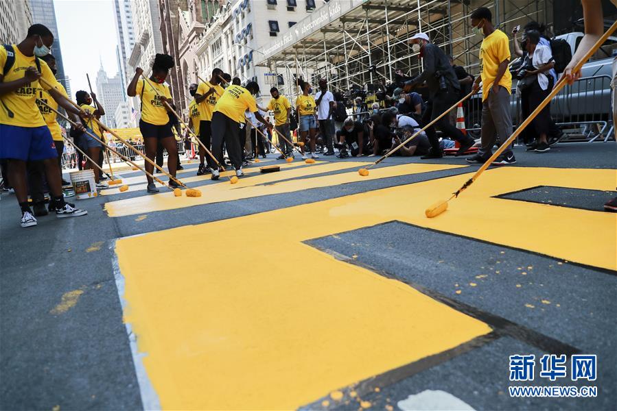 7月9日,在美國紐約第五大道特朗普大廈前,人們涂寫“黑人的命也是命”標(biāo)語。當(dāng)天,數(shù)十人在紐約第五大道特朗普大廈前的路面上涂寫“黑人的命也是命”標(biāo)語。紐約市計(jì)劃在多處地點(diǎn)涂寫“黑人的命也是命”標(biāo)語。新華社記者王迎攝