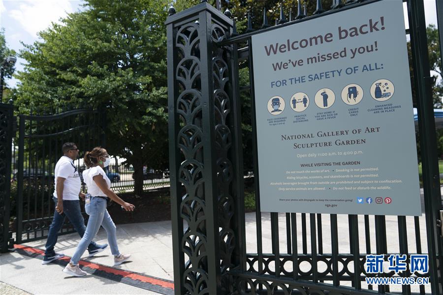 7月11日,人們在美國華盛頓國家藝術(shù)畫廊雕塑公園游覽時經(jīng)過門口關(guān)于疫情防控的告示。新華社記者劉杰攝