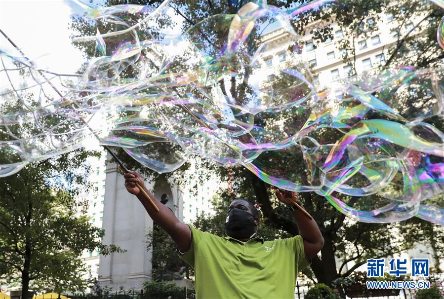 7月14日,美國紐約街頭一名戴口罩的男子表演“泡泡秀”。美國約翰斯·霍普金斯大學:截至北京時間15日6時34分,全球新冠確診病例達13258016例,死亡病例為576752例。美國是全球疫情最嚴重的國家,確診病例達3416222例,死亡病例為136319例。新華社記者 王迎 攝