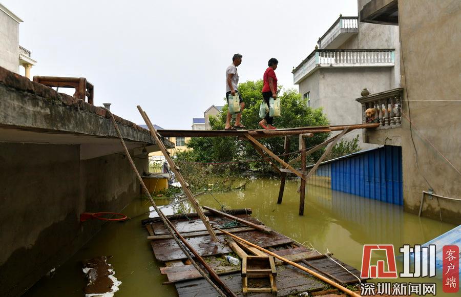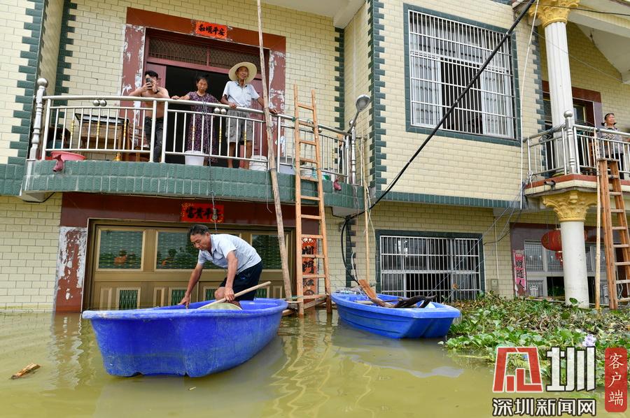 2020年7月15日,江西省鄱陽縣油墩街鎮(zhèn)同興村,村莊受到洪水圍困,大部分村民已經(jīng)被轉(zhuǎn)移出去,仍有少數(shù)村民選擇留守家中積極自救繼續(xù)生活。7月8日晚,鄱陽縣油墩街鎮(zhèn)西江因特大暴雨出現(xiàn)漫堤決口,5個行政村被洪水圍困,數(shù)萬名群眾被及時疏散轉(zhuǎn)移。同興村村民張瑤康回憶起了當(dāng)時的場景,“水一下子就涌進(jìn)來,等緩過神來趕緊向二樓轉(zhuǎn)移一樓的物品。洪水來時只從一樓搶到了一些輕便易拿的東西,冰箱、洗衣機(jī)之類的大物件,至今仍浸泡在一樓水中?!?5日,記者跟隨張瑤康乘船回家,抵達(dá)后看到,一樓淹沒在水中,一個綁在二樓護(hù)欄的木梯成為進(jìn)出“家門”的唯一通道?!懊刻靹澊ゴ謇镞\(yùn)送水和食物,家里有煤氣罐和灶臺。因為80多歲的老母親行動不便,我們選擇留守家中。”“雖然對岸就有安置點(diǎn),但還是更愿待在自己家里,一來是不愿意給政府添麻煩,二來能每天看著自己的房子心里踏實?!蓖d村村民張長來夫婦帶著剛剛領(lǐng)到的大米、方便面、飲用水乘船回到家中。記者在現(xiàn)場看到,隨著各方救援力量和物資的匯聚,被洪水圍困的村民生活雖有不便,但生活仍在繼續(xù)。“房子不倒,家就在,我們要積極面對,早日重建家園?!睆埇幙蹈嬖V記者。