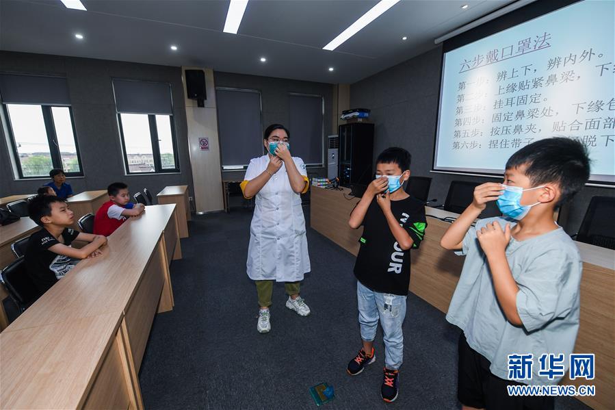 7月16日,小學(xué)生在東林鎮(zhèn)衛(wèi)生院醫(yī)護(hù)人員的示范和講解下學(xué)習(xí)正確佩戴口罩。當(dāng)日,浙江省湖州市吳興區(qū)東林鎮(zhèn)舉辦暑期“安全防護(hù)小超人”主題活動?;顒佑舍t(yī)護(hù)人員、消防隊員等為學(xué)生及家長講授日常安全避險及溺水急救知識,中小學(xué)們還在現(xiàn)場學(xué)習(xí)了簡易包扎、心肺復(fù)蘇的正確方式,并了解滅火器、滅火毯等消防器材的使用,為學(xué)生平安過暑期打好安全防護(hù)“預(yù)防針”。新華社記者 徐昱 攝