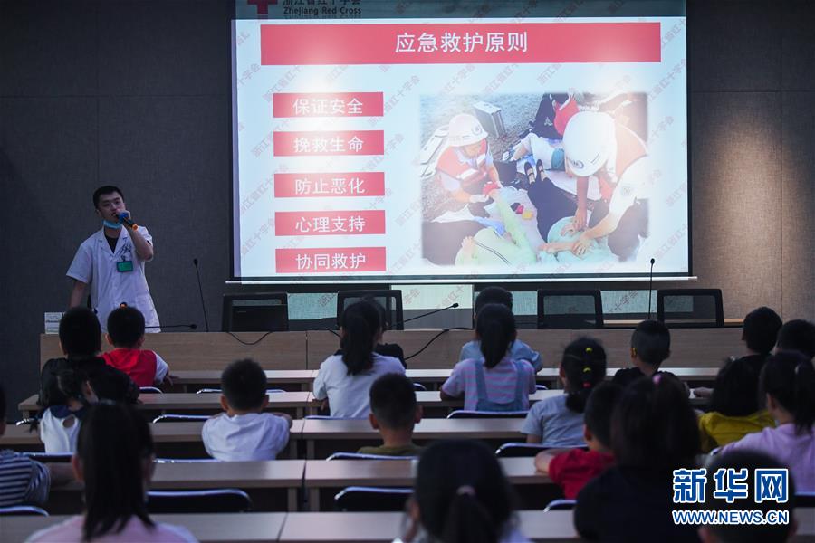 7月16日,東林鎮(zhèn)衛(wèi)生院的醫(yī)護(hù)人員(左一)在給學(xué)生們上應(yīng)急救護(hù)課。當(dāng)日,浙江省湖州市吳興區(qū)東林鎮(zhèn)舉辦暑期“安全防護(hù)小超人”主題活動。活動由醫(yī)護(hù)人員、消防隊員等為學(xué)生及家長講授日常安全避險及溺水急救知識,中小學(xué)們還在現(xiàn)場學(xué)習(xí)了簡易包扎、心肺復(fù)蘇的正確方式,并了解滅火器、滅火毯等消防器材的使用,為學(xué)生平安過暑期打好安全防護(hù)“預(yù)防針”。新華社記者 徐昱 攝