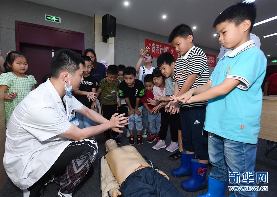 7月16日,東林鎮(zhèn)衛(wèi)生院的醫(yī)護(hù)人員(左一)在給學(xué)生們示范和講解心肺復(fù)蘇的操作知識。當(dāng)日,浙江省湖州市吳興區(qū)東林鎮(zhèn)舉辦暑期“安全防護(hù)小超人”主題活動。活動由醫(yī)護(hù)人員、消防隊員等為學(xué)生及家長講授日常安全避險及溺水急救知識,中小學(xué)們還在現(xiàn)場學(xué)習(xí)了簡易包扎、心肺復(fù)蘇的正確方式,并了解滅火器、滅火毯等消防器材的使用,為學(xué)生平安過暑期打好安全防護(hù)“預(yù)防針”。新華社記者 徐昱 攝