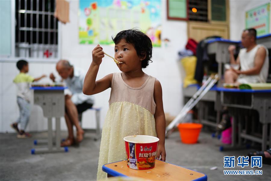 小朋友在江西鄱陽縣五一中心學校安置點吃飯(7月9日攝)。新華社記者周密攝