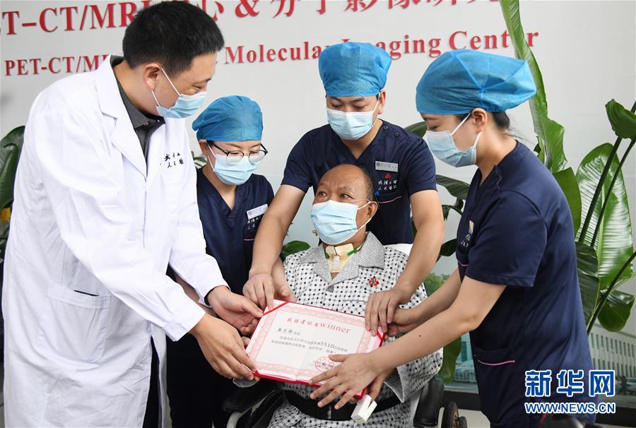 7月21日,國(guó)家衛(wèi)健委醫(yī)政醫(yī)管局醫(yī)療質(zhì)量與評(píng)價(jià)處副處長(zhǎng)馬旭東(左一)為崔先生頒發(fā)了編號(hào)為“5510”的“戰(zhàn)勝者證書”。新華社記者程敏攝