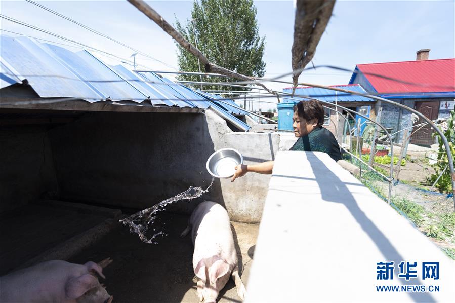 7月23日,在黑龍江省撫遠市濃橋鎮(zhèn)東方紅村,康麗艷向豬圈中灑水降溫。新華社記者 謝劍飛 攝
