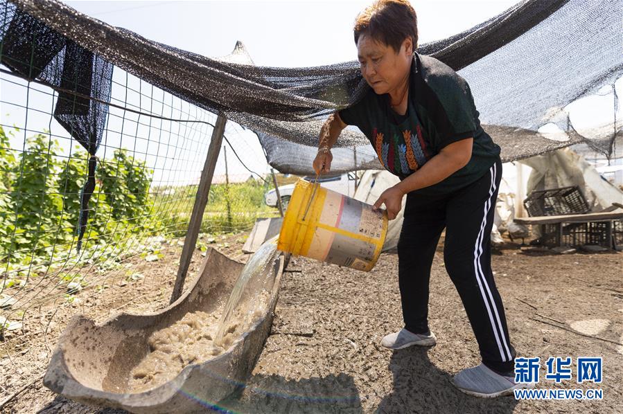 7月23日,在黑龍江省撫遠市濃橋鎮(zhèn)東方紅村,康麗艷在給鴨和鵝準備飲用水。新華社記者 謝劍飛 攝