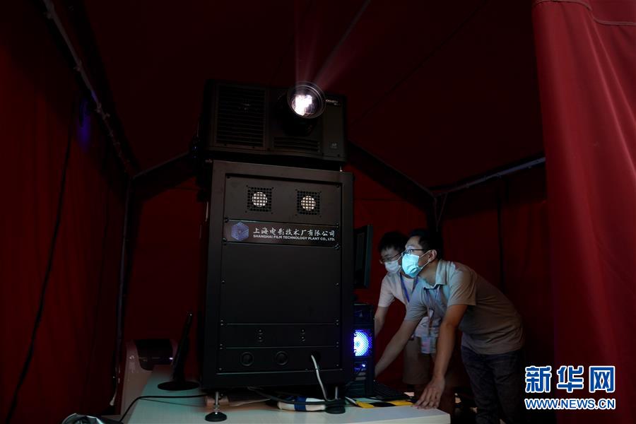 7月25日,在上海大寧音樂(lè)廣場(chǎng)的露天電影展映現(xiàn)場(chǎng),放映人員在工作。新華社記者 劉穎 攝
