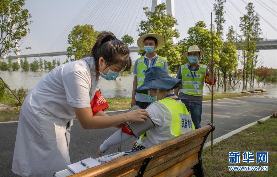 7月24日,在武漢青山江灘羅家港防汛值守哨棚旁,武昌區(qū)楊園街社區(qū)衛(wèi)生服務(wù)中心醫(yī)務(wù)人員為巡堤員測(cè)量血壓和心率。從7月6日開始,該中心醫(yī)務(wù)人員攜帶醫(yī)藥箱和消毒器具每天兩次往返于3.7公里的長(zhǎng)江岸堤,為巡堤員測(cè)量血壓、監(jiān)測(cè)體溫,并宣傳防疫知識(shí)。新華社記者 肖藝九 攝