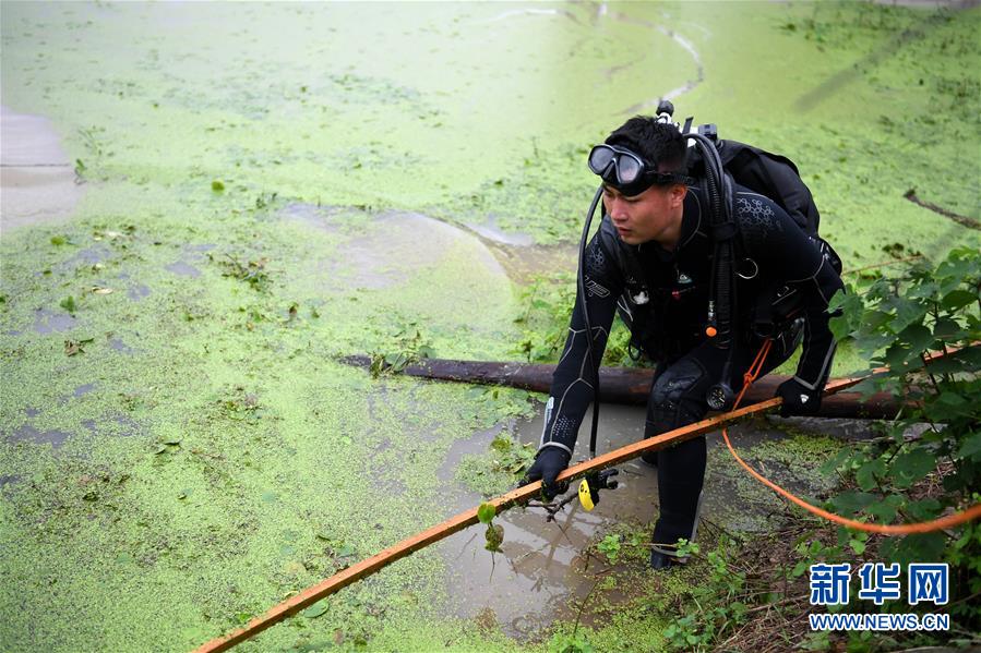 7月24日,在安徽省廬江縣臺創(chuàng)園小南河段,吳正寶下水前清理水上雜物。新華社記者劉軍喜攝