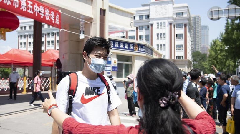 7月7日,在山西省太原市第五中學(xué)??键c,結(jié)束首場科目考試的考生走出考場。
