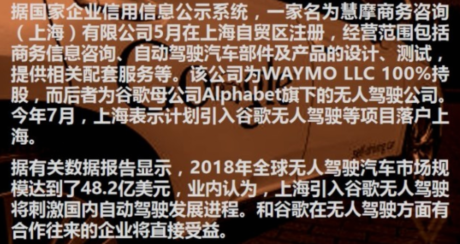 谷歌母公司Alphabet旗下研究自動駕駛的部門Waymo在自動駕駛領(lǐng)域處于全球領(lǐng)先水平,當(dāng)前其已經(jīng)完成800萬英里(約1287萬公里)自動駕駛汽車公共道路測試,模擬測試?yán)锍踢_(dá)到50億英里(約80.47億公里)。Waymo計劃在為今年下半年向部分地區(qū)的美國消費者推出無人駕駛服務(wù)。