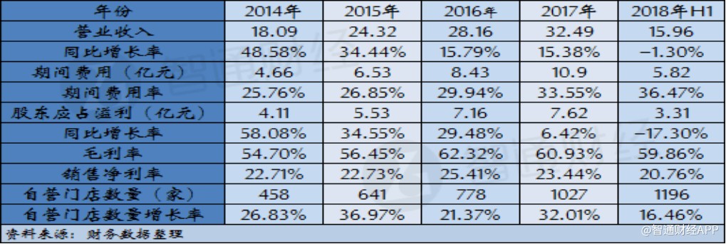 根據(jù)智通財(cái)經(jīng)APP的梳理,周黑鴨自營(yíng)門店數(shù)量在2014年為458家,此后三年公司自營(yíng)門店數(shù)量每年都有超過20%的增長(zhǎng),但期間公司營(yíng)業(yè)收入增幅卻呈現(xiàn)放緩的趨勢(shì)。與此同時(shí),公司門店數(shù)量的增長(zhǎng)也帶來(lái)費(fèi)用率逐年提升,截至2017年,公司期間費(fèi)用率達(dá)到33.55%,以至于公司凈利潤(rùn)增速同比下滑超過23個(gè)百分點(diǎn)。公司2018年中期財(cái)報(bào)顯示,上半年公司門店數(shù)量?jī)粼鲩L(zhǎng)169家,較2017年增長(zhǎng)16.46%,門店數(shù)量快速增長(zhǎng)的勢(shì)頭雖然的已延續(xù),但卻支撐不起公司營(yíng)收繼續(xù)保持增長(zhǎng),同時(shí)公司期間費(fèi)用率進(jìn)一步提升至36.47%,導(dǎo)致盈利水平大幅下滑。