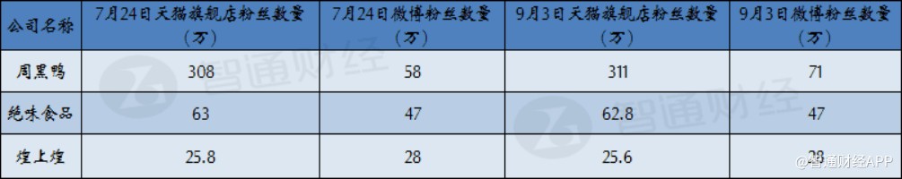 智通財(cái)經(jīng)APP曾在7月24日統(tǒng)計(jì)得到周黑鴨在當(dāng)天的天貓旗艦店粉絲數(shù)量為308萬(wàn),是其他兩大鹵制品公司的數(shù)倍,截至9月3日,周黑鴨天貓旗艦店的粉絲數(shù)量已經(jīng)增長(zhǎng)至311萬(wàn),反觀絕味和煌上煌不僅沒有增長(zhǎng)反而有小幅下滑。此外,周黑鴨微博粉絲數(shù)量在9月3日也增長(zhǎng)至71萬(wàn)較7月27日增長(zhǎng)了13萬(wàn),而其他兩家公司的微博粉絲數(shù)量還在原地踏步。