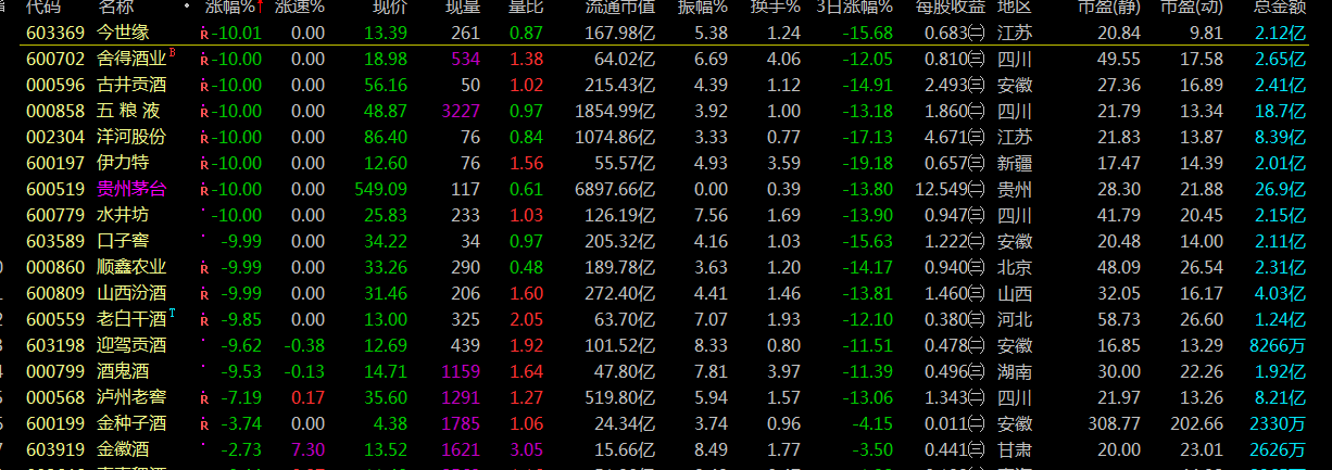 云財經(jīng)訊,10月29日早間,白酒股集體暴跌,截至發(fā)稿,貴州茅臺(600519)、洋河股份(002304)、口子窖(603589)、順鑫農(nóng)業(yè)(000860)跌停、五糧液(000858)逼近跌停。據(jù)統(tǒng)計,近5個交易日,A股白酒板塊總市值縮水超3400億元。消息面上,今年貴州茅臺(600519)前三季度的業(yè)績增速有所放緩。公司第三季度的凈利實際同比增長率僅為2.71%。