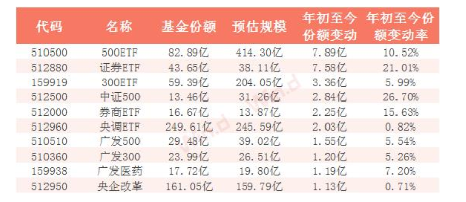 年初至今股票ETF份額增長(zhǎng)TOP10:年初至今南方中證500ETF(510500)份額增長(zhǎng)了7.89億,增長(zhǎng)勢(shì)頭最猛。此外,華夏中證500ETF(512500)份額增長(zhǎng)2.84億,廣發(fā)中證500ETF(510510)份額增長(zhǎng)1.55億。