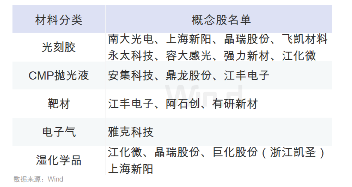 從技術(shù)水平來看,PCB光刻膠是目前國(guó)產(chǎn)替代進(jìn)度最快的。A股公司中,飛凱材料(300398)已經(jīng)在高端的濕膜光刻膠領(lǐng)域通過下游廠商驗(yàn)證;面板光刻膠進(jìn)度相對(duì)較快,目前永太科技(002326)CF光刻膠已經(jīng)通過華星光電驗(yàn)證。