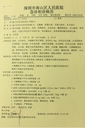 第二天,張女士立刻去深圳市南山區(qū)人民醫(yī)院急診科就診,初步診斷為“全身多處挫傷”。羅小姐說,“當(dāng)時的法醫(yī)鑒定結(jié)果是輕微傷,法醫(yī)鑒定貼好封條交給了派出所?!?/p>