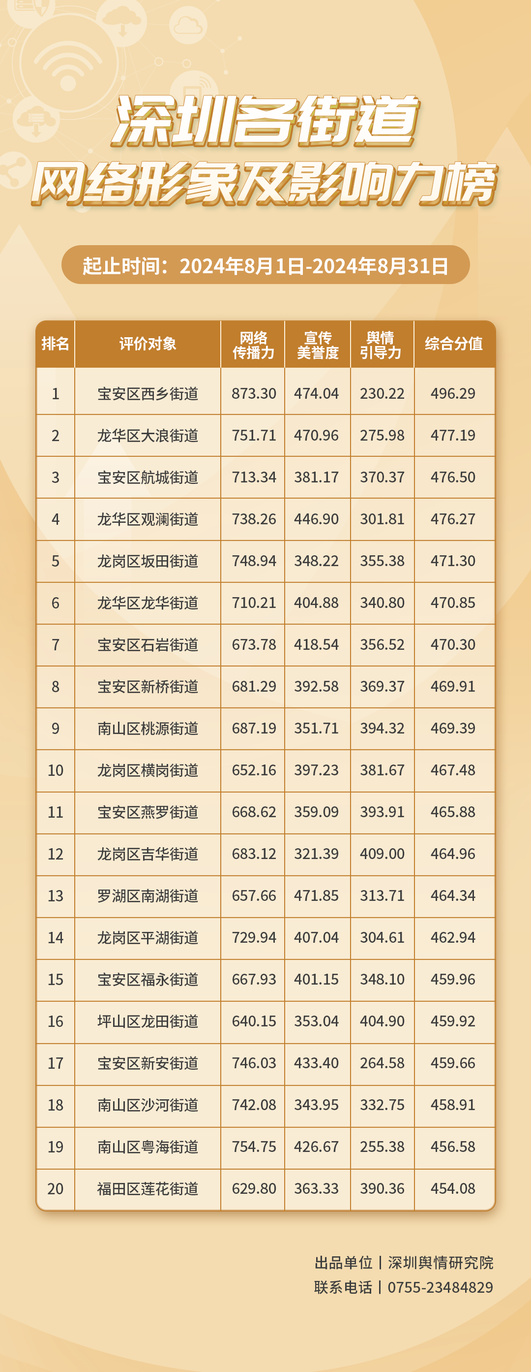 2024年8月,各街道不斷探索治理新路徑,力求效能躍升,《深圳各街道網(wǎng)絡(luò)形象及影響力榜》(8月榜單)發(fā)布,為您揭曉哪些街道網(wǎng)絡(luò)形象治理實效顯著,成標(biāo)桿,本期榜單數(shù)據(jù)統(tǒng)計范圍為2024年8月1日至8月31日。