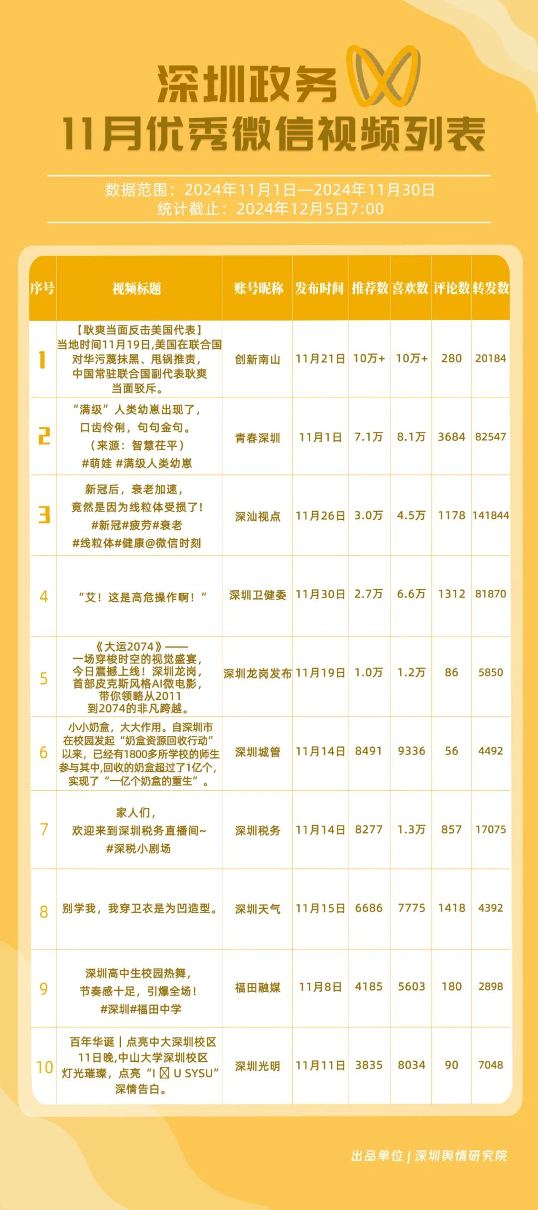 11月,獲“深圳優(yōu)秀政務(wù)微信視頻號(hào)”稱號(hào)的分別是“深汕視點(diǎn)”“青春深圳”“深圳衛(wèi)健委”“創(chuàng)新南山”“深圳龍崗發(fā)布”“福田融媒”“深圳教育”“深圳天氣”“深圳稅務(wù)”“深圳光明”。其中,“深汕視點(diǎn)”與“青春深圳”通過(guò)積極轉(zhuǎn)發(fā)涵蓋廣泛領(lǐng)域的優(yōu)質(zhì)視頻內(nèi)容,贏得了網(wǎng)民的廣泛點(diǎn)贊與推薦,彰顯了其在內(nèi)容聚合與傳播上的獨(dú)到之處?!吧钲谛l(wèi)健委”則專注于衛(wèi)生健康領(lǐng)域,發(fā)布了一系列高質(zhì)量的內(nèi)容,深受網(wǎng)民喜愛(ài),進(jìn)一步鞏固了其在健康傳播領(lǐng)域的領(lǐng)先地位。