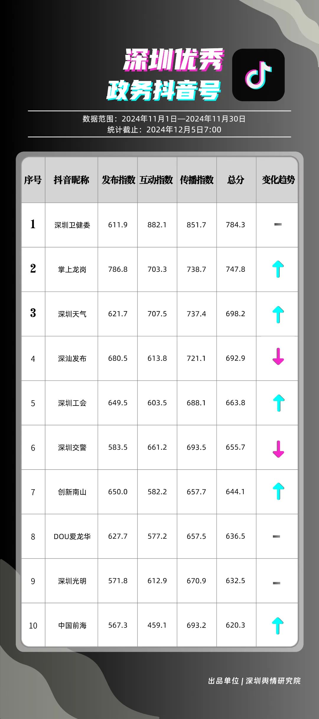 《深圳優(yōu)秀政務(wù)新媒體矩陣》2024年11月榜單揭曉,讓我們一同關(guān)注,哪些新媒體矩陣能夠憑借優(yōu)異表現(xiàn)嶄露新姿,成為加速政務(wù)傳播與服務(wù)創(chuàng)新發(fā)展的先鋒。