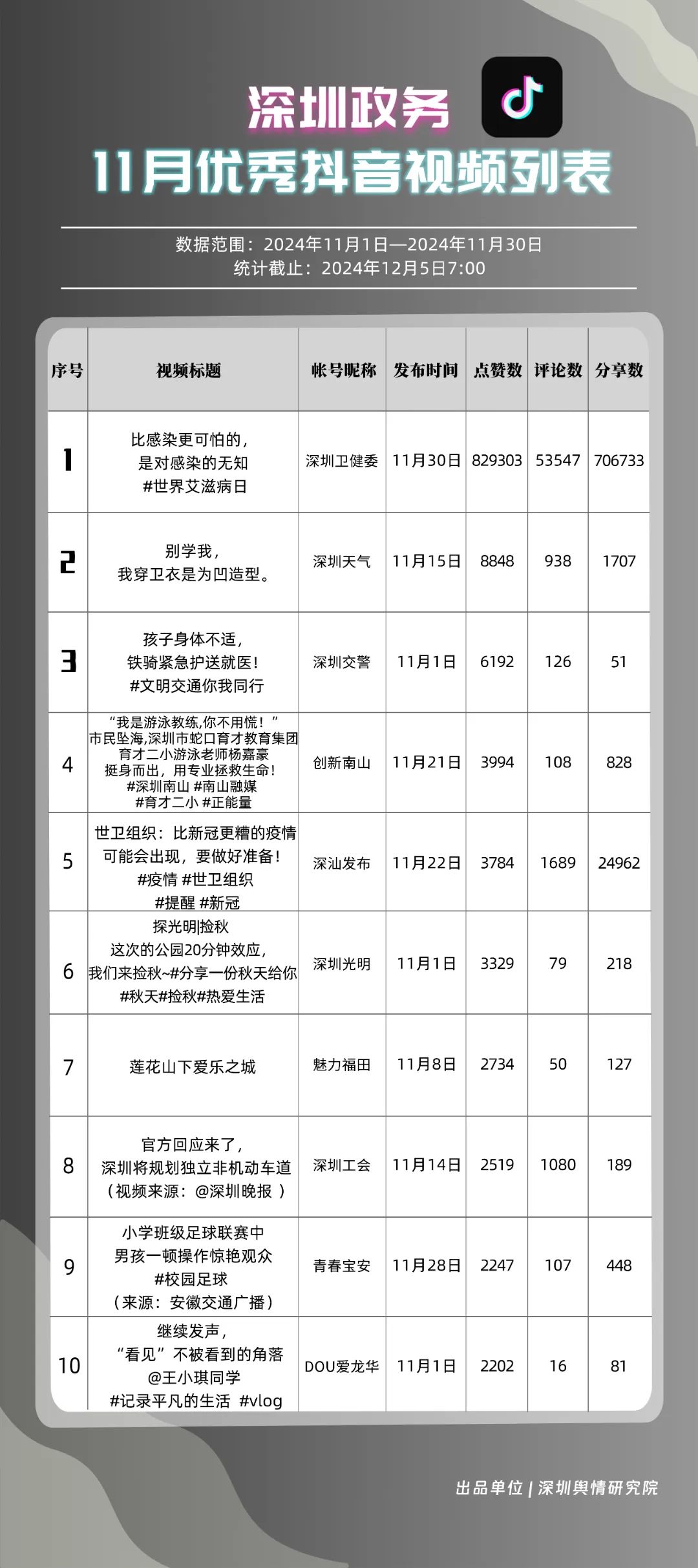 11月,“深圳衛(wèi)健委”“掌上龍崗”“深圳天氣”“深汕發(fā)布”“深圳工會(huì)”“深圳交警”“創(chuàng)新南山”“DOU愛(ài)龍華”“深圳光明”“中國(guó)前海”共10個(gè)政務(wù)抖音號(hào)獲得“深圳優(yōu)秀政務(wù)抖音號(hào)”稱號(hào)?!吧钲谛l(wèi)健委”憑借高質(zhì)量劇情內(nèi)容,巧妙融入健康知識(shí),視頻累計(jì)收獲近百萬(wàn)點(diǎn)贊。同時(shí),“掌上龍崗”和“深圳天氣”也在視頻內(nèi)容創(chuàng)新上不斷探索,通過(guò)優(yōu)化宣傳策略和信息傳播方式,使得網(wǎng)民能夠在輕松愉快的氛圍中了解龍崗區(qū)的最新動(dòng)態(tài)和深圳的天氣信息,展現(xiàn)了政務(wù)抖音號(hào)的獨(dú)特魅力與社會(huì)影響力。