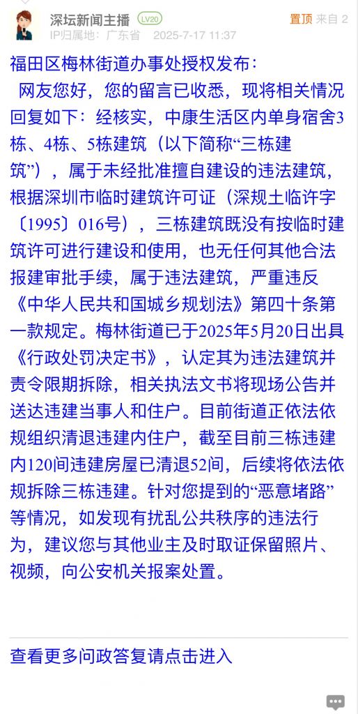 網(wǎng)友您好,您的留言已收悉,現(xiàn)將相關(guān)情況回復(fù)如下:經(jīng)核實,中康生活區(qū)內(nèi)單身宿舍3棟、4棟、5棟建筑(以下簡稱“三棟建筑”),屬于未經(jīng)批準擅自建設(shè)的違法建筑,根據(jù)深圳市臨時建筑許可證(深規(guī)土臨許字〔1995〕016號),三棟建筑既沒有按臨時建筑許可進行建設(shè)和使用,也無任何其他合法報建審批手續(xù),屬于違法建筑,嚴重違反《中華人民共和國城鄉(xiāng)規(guī)劃法》第四十條第一款規(guī)定。梅林街道已于2025年5月20日出具《行政處罰決定書》,認定其為違法建筑并責(zé)令限期拆除,相關(guān)執(zhí)法文書將現(xiàn)場公告并送達違建當(dāng)事人和住戶。目前街道正依法依規(guī)組織清退違建內(nèi)住戶,截至目前三棟違建內(nèi)120間違建房屋已清退52間,后續(xù)將依法依規(guī)拆除三棟違建。針對您提到的“惡意堵路”等情況,如發(fā)現(xiàn)有擾亂公共秩序的違法行為,建議您與其他業(yè)主及時取證保留照片、視頻,向公安機關(guān)報案處置。
