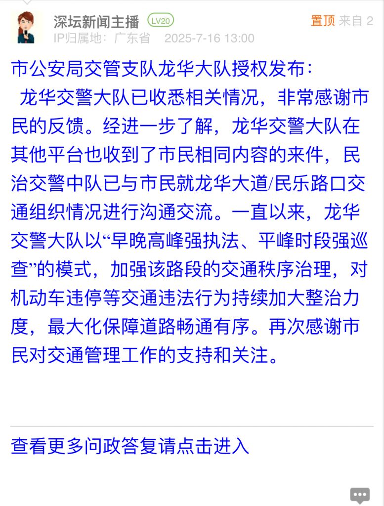 龍華交警大隊已收悉相關(guān)情況,非常感謝市民的反饋。經(jīng)進一步了解,龍華交警大隊在其他平臺也收到了市民相同內(nèi)容的來件,民治交警中隊已與市民就龍華大道/民樂路口交通組織情況進行溝通交流。一直以來,龍華交警大隊以“早晚高峰強執(zhí)法、平峰時段強巡查”的模式,加強該路段的交通秩序治理,對機動車違停等交通違法行為持續(xù)加大整治力度,最大化保障道路暢通有序。再次感謝市民對交通管理工作的支持和關(guān)注。