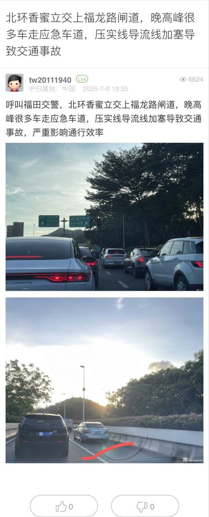 12. 帖文《北環(huán)香蜜立交上福龍路閘道,晚高峰很多車走應(yīng)急車道,壓實線導(dǎo)流線加塞導(dǎo)致交通事故》