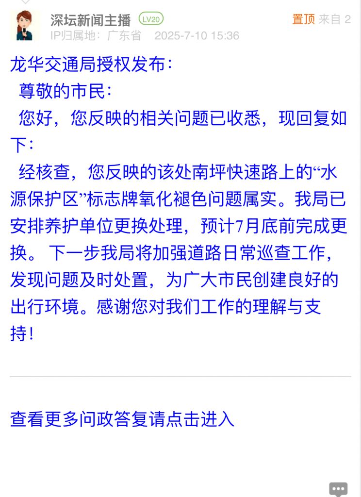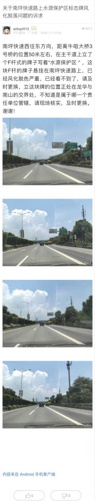 5. 帖文《關(guān)于南坪快速路上水源保護區(qū)標志牌風(fēng)化脫落問題的訴求》