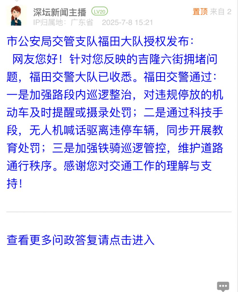 網(wǎng)友您好!針對您反映的吉隆六街擁堵問題,福田交警大隊已收悉。福田交警通過:一是加強路段內(nèi)巡邏整治,對違規(guī)停放的機動車及時提醒或攝錄處罰;二是通過科技手段,無人機喊話驅(qū)離違停車輛,同步開展教育處罰;三是加強鐵騎巡邏管控,維護道路通行秩序。感謝您對交通工作的理解與支持!