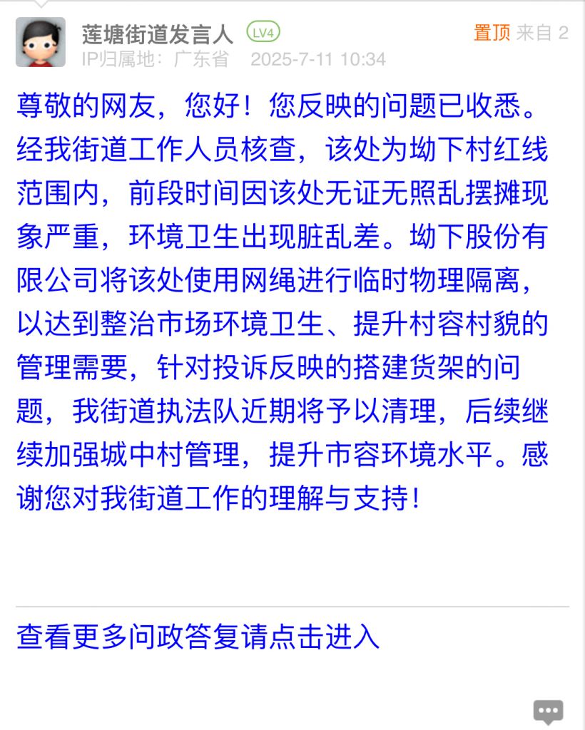 尊敬的網(wǎng)友,您好!您反映的問題已收悉。經(jīng)我街道工作人員核查,該處為坳下村紅線范圍內(nèi),前段時間因該處無證無照亂擺攤現(xiàn)象嚴重,環(huán)境衛(wèi)生出現(xiàn)臟亂差。坳下股份有限公司將該處使用網(wǎng)繩進行臨時物理隔離,以達到整治市場環(huán)境衛(wèi)生、提升村容村貌的管理需要,針對投訴反映的搭建貨架的問題,我街道執(zhí)法隊近期將予以清理,后續(xù)繼續(xù)加強城中村管理,提升市容環(huán)境水平。感謝您對我街道工作的理解與支持!