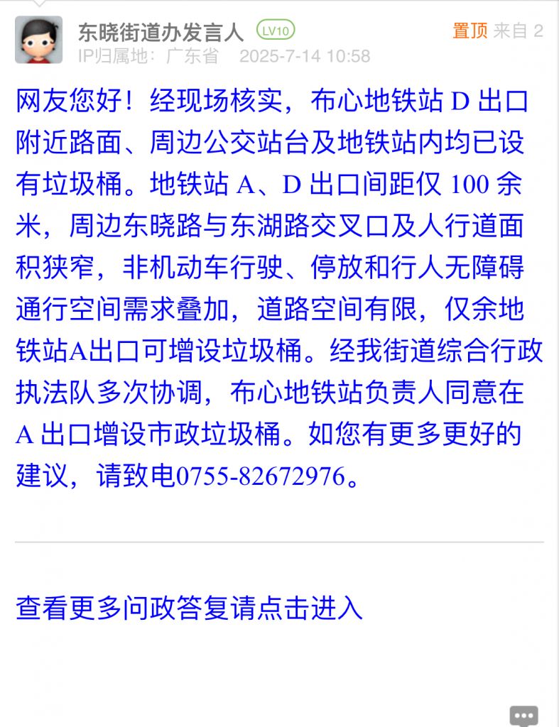網(wǎng)友您好!經(jīng)現(xiàn)場核實,布心地鐵站 D 出口附近路面、周邊公交站臺及地鐵站內(nèi)均已設(shè)有垃圾桶。地鐵站 A、D 出口間距僅 100 余米,周邊東曉路與東湖路交叉口及人行道面積狹窄,非機動車行駛、停放和行人無障礙通行空間需求疊加,道路空間有限,僅余地鐵站A出口可增設(shè)垃圾桶。經(jīng)我街道綜合行政執(zhí)法隊多次協(xié)調(diào),布心地鐵站負責(zé)人同意在 A 出口增設(shè)市政垃圾桶。如您有更多更好的建議,請致電0755-82672976。