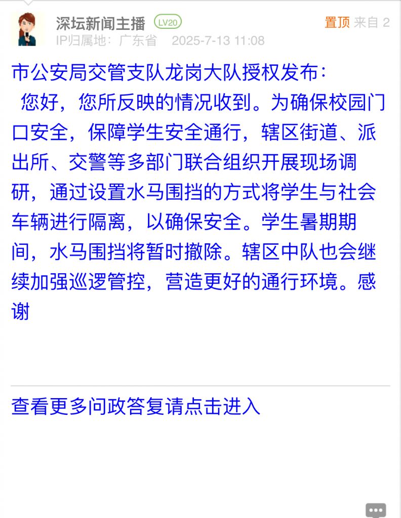 您好,您所反映的情況收到。為確保校園門口安全,保障學(xué)生安全通行,轄區(qū)街道、派出所、交警等多部門聯(lián)合組織開展現(xiàn)場調(diào)研,通過設(shè)置水馬圍擋的方式將學(xué)生與社會車輛進行隔離,以確保安全。學(xué)生暑期期間,水馬圍擋將暫時撤除。轄區(qū)中隊也會繼續(xù)加強巡邏管控,營造更好的通行環(huán)境。感謝