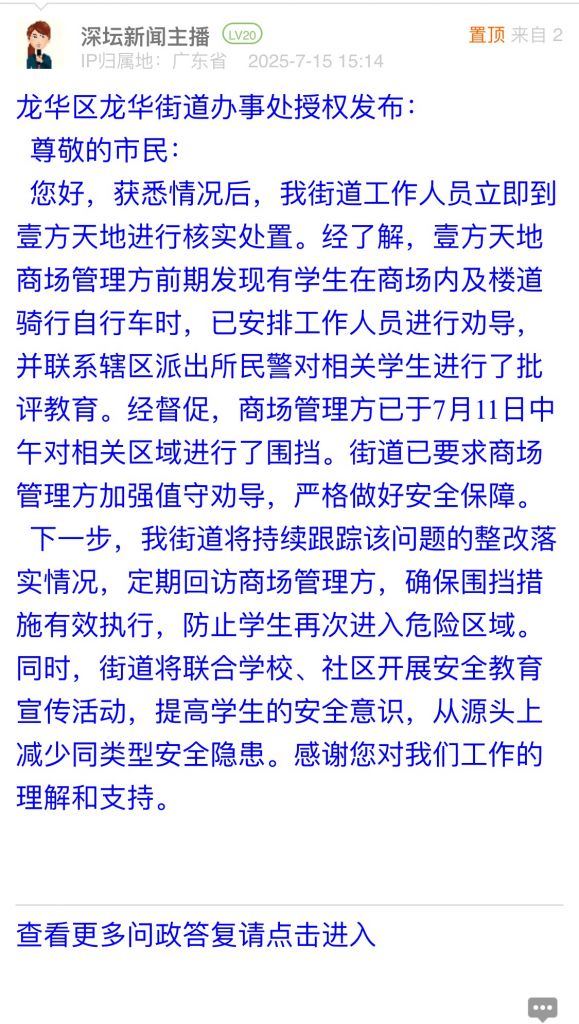 您好,獲悉情況后,我街道工作人員立即到壹方天地進行核實處置。經(jīng)了解,壹方天地商場管理方前期發(fā)現(xiàn)有學(xué)生在商場內(nèi)及樓道騎行自行車時,已安排工作人員進行勸導(dǎo),并聯(lián)系轄區(qū)派出所民警對相關(guān)學(xué)生進行了批評教育。經(jīng)督促,商場管理方已于7月11日中午對相關(guān)區(qū)域進行了圍擋。街道已要求商場管理方加強值守勸導(dǎo),嚴格做好安全保障。