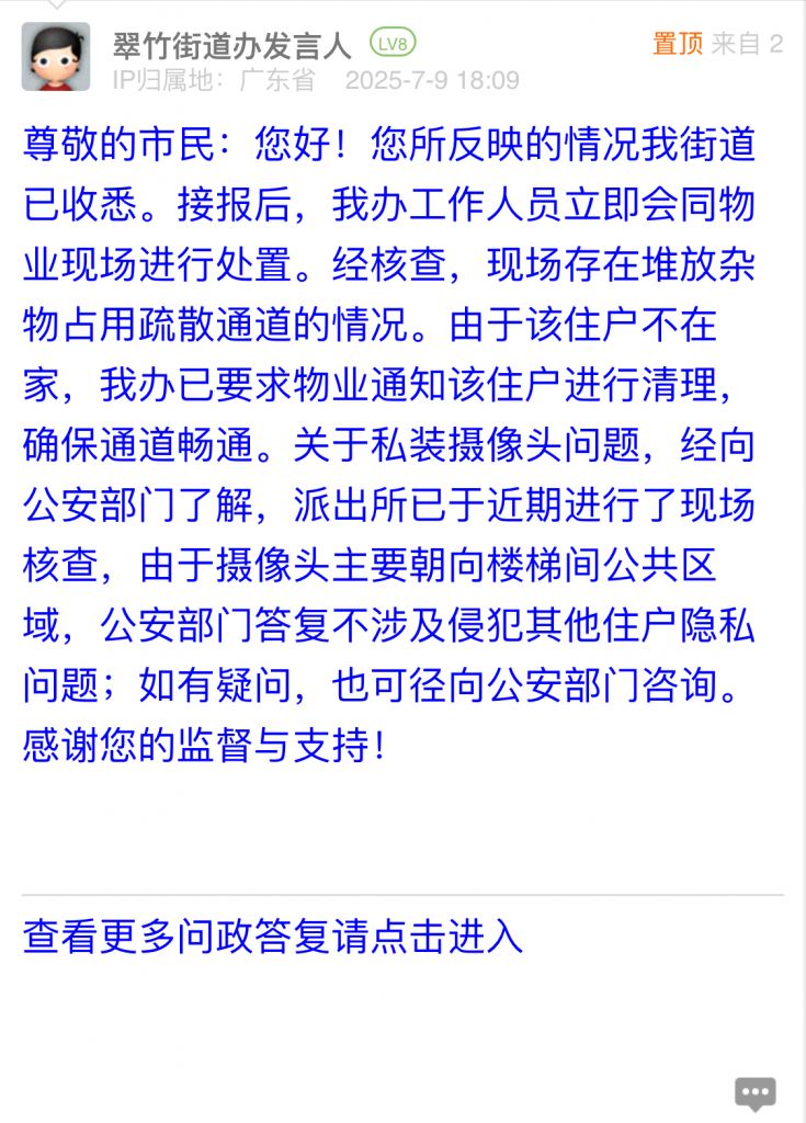 尊敬的市民:您好!您所反映的情況我街道已收悉。接報后,我辦工作人員立即會同物業(yè)現(xiàn)場進行處置。經(jīng)核查,現(xiàn)場存在堆放雜物占用疏散通道的情況。由于該住戶不在家,我辦已要求物業(yè)通知該住戶進行清理,確保通道暢通。關(guān)于私裝攝像頭問題,經(jīng)向公安部門了解,派出所已于近期進行了現(xiàn)場核查,由于攝像頭主要朝向樓梯間公共區(qū)域,公安部門答復(fù)不涉及侵犯其他住戶隱私問題;如有疑問,也可徑向公安部門咨詢。感謝您的監(jiān)督與支持!